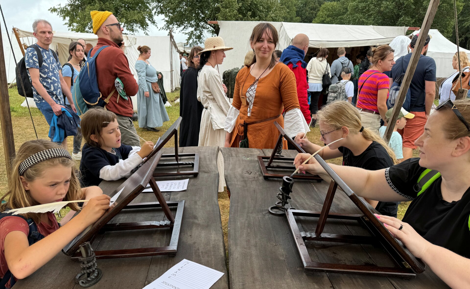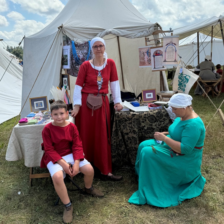 Jeśli tylko możemy, to jedziemy na Grunwald gdzie występujemy na kramie iluminatora i kaligrafa. Jest to wspaniała okazja do przekazywania naszej pasji do rękopisów w bardzo bezpośredni sposób. Będąc na Grunwaldzie opowiadamy odwiedzającym kramy o naszym rzemiośle pokazując materiały na których pracujemy, zarażając pasją do piękna odręcznej kaligrafii i niesamowitych iluminowanych dekoracji. W 2024 roku prowadziliśmy już jako Fundacja Manuskrypt kilka warsztatów dla dzieci – z introligatorstwa, kaligrafii, szycia jałmużniczek, bestiariuszy.