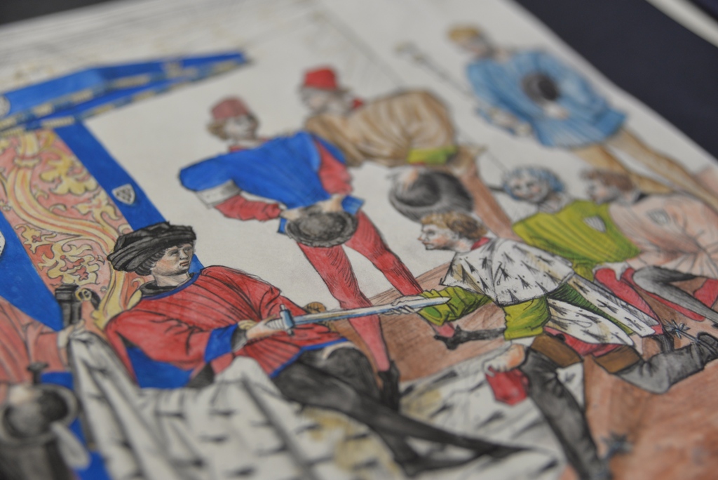 - Miniatury z Traktatu o formach i przepisach turniejowych, René d’Anjou, TRAITÉ DE LA FORME ET DEVIS D’UN TOURNOIS, nr 3090 IV. Jest to XV wieczny rękopis autorstwa René d’Anjou, władcy i mecenasa kultury rycerskiej. Traktat szczegółowo opisuje zasady organizacji turniejów, ich przebieg, stroje, uzbrojenie oraz ceremoniał. Dzieło miało charakter instruktażowy – określało reguły walki, zachowanie rycerzy oraz rolę sędziów i heroldów.